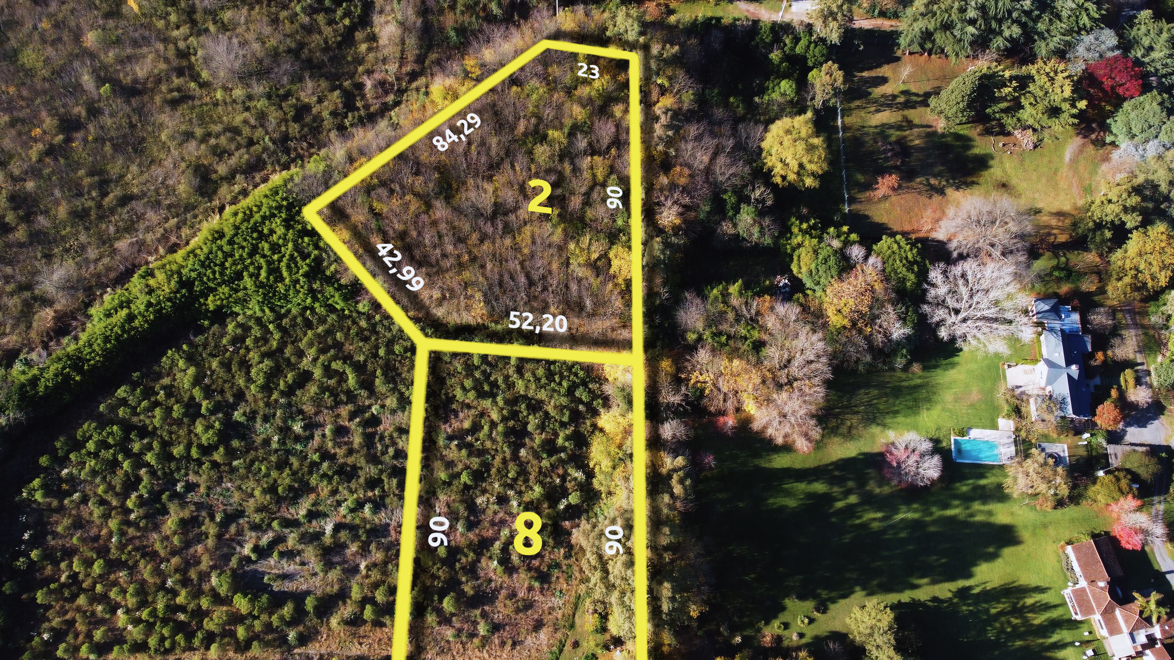 El lote ocho de forma rectangular, tiene una superficie de 4.698 m2 y el lote dos de forma irregular, con una superficie de 5.196 m2. Este lote esta arbolado con variedad de especies.